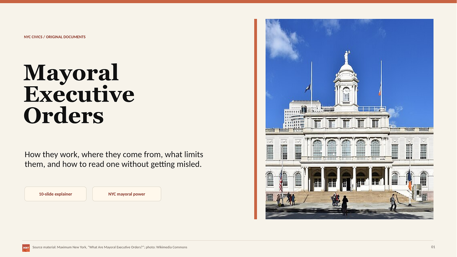 I have included two slides below to illustrate the difference between image-first slide generation, and slide-first side generation. I gave ChatGPT (the web app, $20/mo version) a prompt to use my post on mayoral executive orders as source material, and to create an explainer presentation based on it. Not only was the image-based deck created about a minute faster, it was much prettier out of the gate. These were not one-off results, and the same principle applies to any visual use case (social media, general fun, and so forth).
