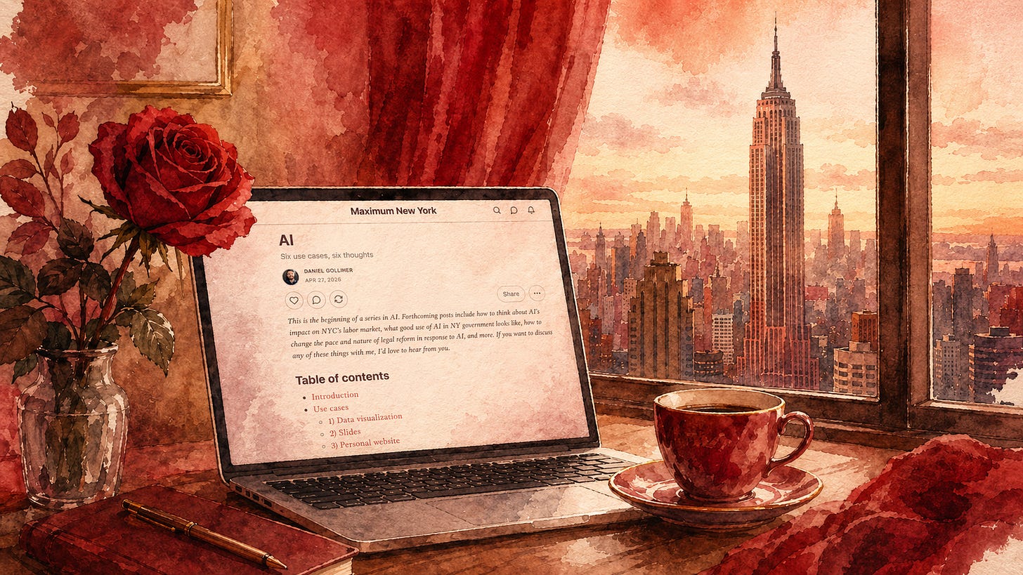 This is the beginning of a series in AI. Forthcoming posts include how to think about AI’s impact on NYC’s labor market, what good use of AI in NY government looks like, how to change the pace and nature of legal reform in response to AI, and more. If you want to discuss any of these things with me, I’d love to hear from you.
