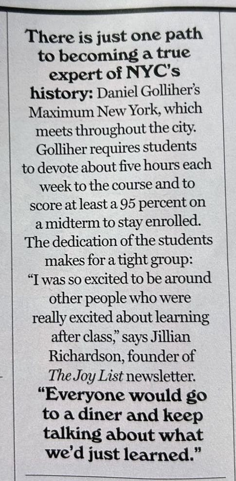 I graduated from Harvard College in 2014 with a degree in Government1, and since then I’ve worked in the legal industry, a coffee shop, higher ed, the legal industry again, and more. I’ve dedicated myself to Maximum New York since March 2022, when I taught its first class.