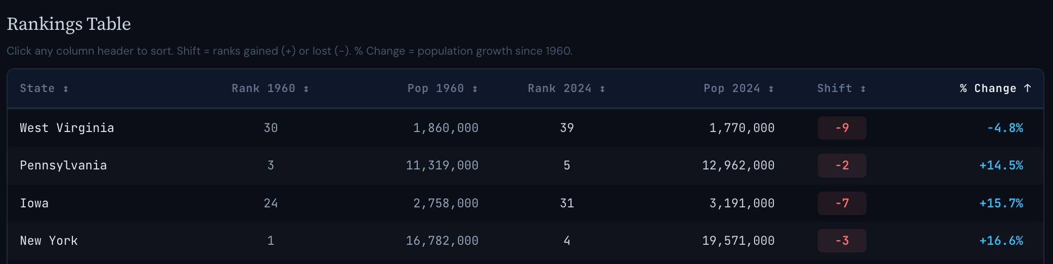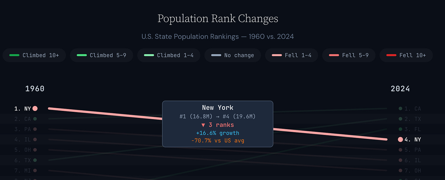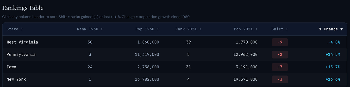 From 1960 through 2024, New York State’s peers in population growth were Iowa and Pennsylvania, which with West Virginia round out the bottom four.