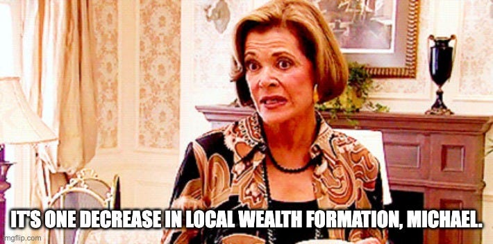 The natural counterpoint to this is that increased tax revenue can be deployed by the government to drive local wealth formation via investments in infrastructure, other public goods, and so forth. Like if the city and state can build more subways, that would naturally increase land values, increase the “opportunity shed” of where people could live and work, and generally expand economic growth and possibility. So perhaps the taxes create a headwind for some private wealth formation, but that is offset by public wealth formation.