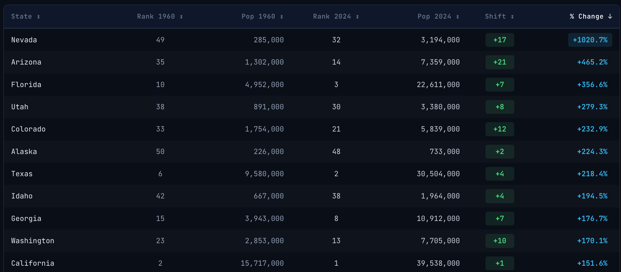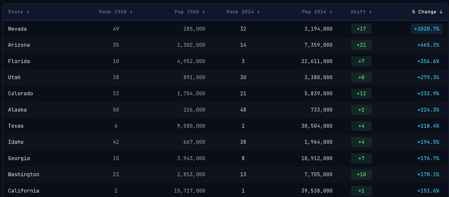 The fastest growing states in that time were to the south and west.