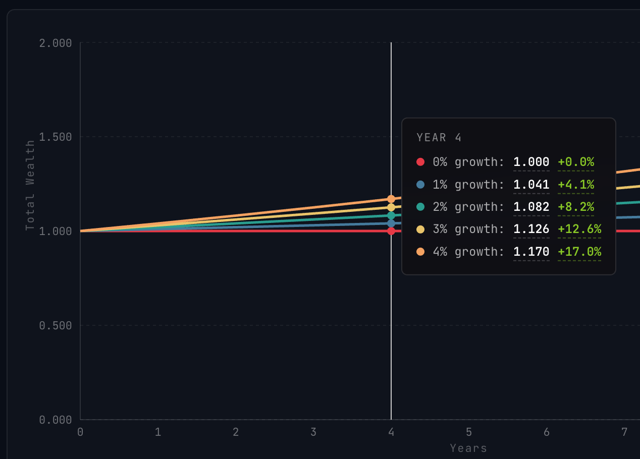 In the image below, you can see the difference that a 1%, 5%, and 10% growth rate make over just five years. You could have 5.1% more in the lowest growth scenario, or 61.1% more in the highest. But clearly anything between them is a premium worth gaining too, because your growth rate today affects your growth rate tomorrow.