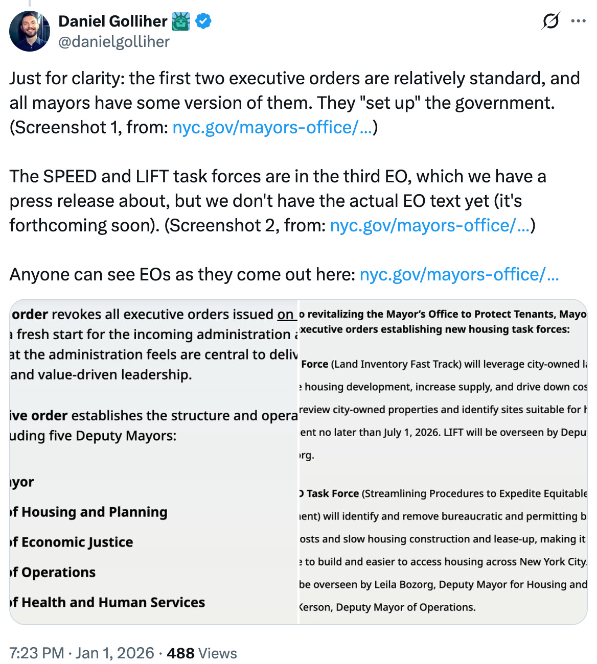 I don’t mean to pick on the X account pictured below, but they tripped out of the gate here. They stated, incorrectly, what Mayor Mamdani’s first two executive orders were, and didn’t link to anything: